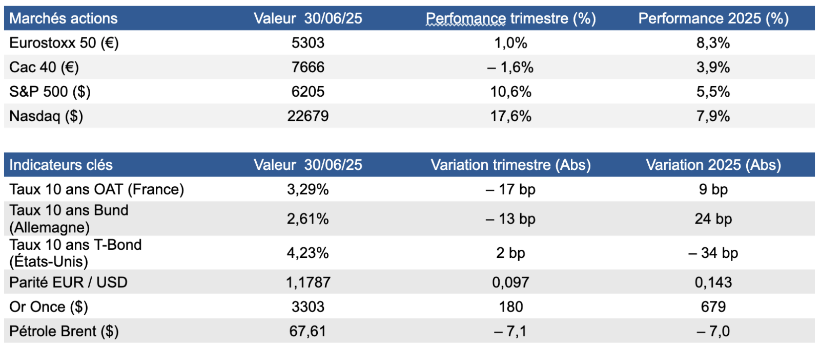 Nous sommes restés disciplinés sur nos convictions et notre allocation d’actifs a permis de maintenir un équilibre entre prise de risque et prudence, tout en tirant parti des opportunités identifiées sur les obligations, les matières premières, et certains segments actions. Nous avons eu des déceptions sur certains secteurs comme le luxe et les semi-conducteurs qui ont pénalisé les portefeuilles. Le secteur bancaire étant le grand gagnant de ce premier semestre.