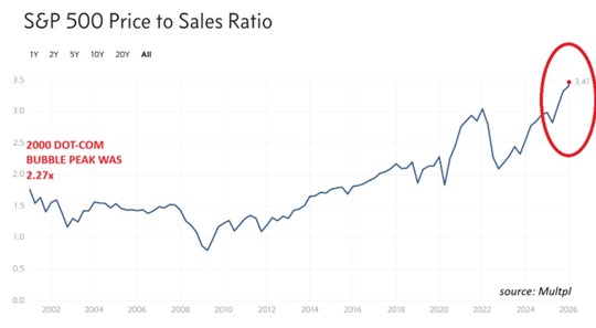 Aujourd’hui, le ratio cours/chiffre d’affaires du S&P 500 atteint 3,47, un niveau jamais vu auparavant.