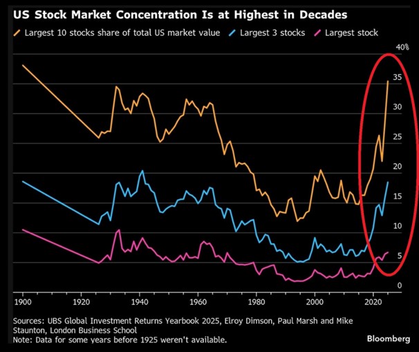 La concentration du marché est aujourd'hui à son plus haut niveau historique. En effet, les 10 principales actions américaines représentent 35,4 % de la valeur totale du marché US. Elles représentent également 40 % de l'indice S&P 500, un niveau de concentration jamais vu depuis les années 1960.On observe aussi que les trois premières valeurs représentent près de 18,5 % du marché, un chiffre record.