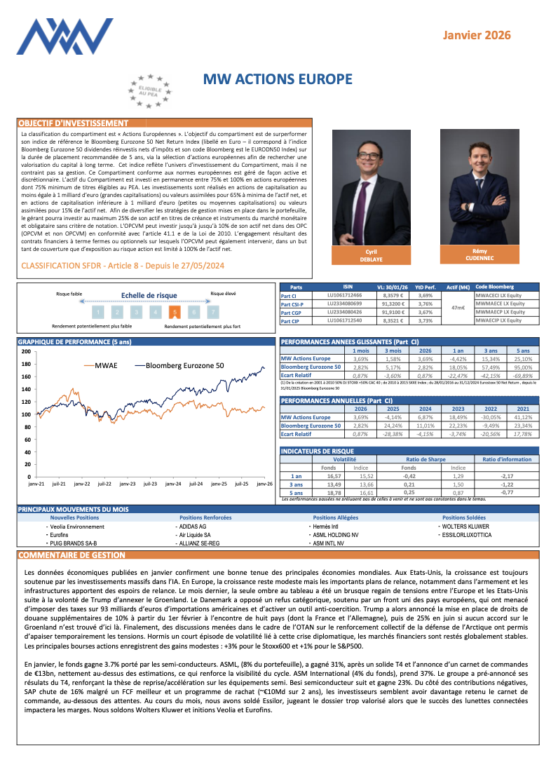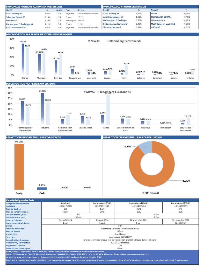 Le compartiment MW Actions Europe de la Sicav Luxembourgeoise MW ASSET MANAGEMENT est géré de façon active en référence à son indice et n’implique aucune contrainte au niveau de la composition du portefeuille qui est laissée à la discrétion du gestionnaire. Le fonds investit 65% au minimum de ses actifs dans des actions de grandes capitalisations (supérieures à 1 milliard d’euros) ou valeurs assimilées et il peut investir jusqu’à 15% de ses actifs dans des petites et moyennes capitalisations ou valeurs assimilées.