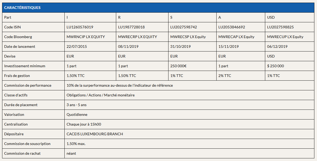 | Code Bloomberg | MWRNCIP LX EQUITY | MWRECRP LX EQUITY | MWRECSP LX Equity | MWRECAP LX Equity | MWRECUP LX Equity |